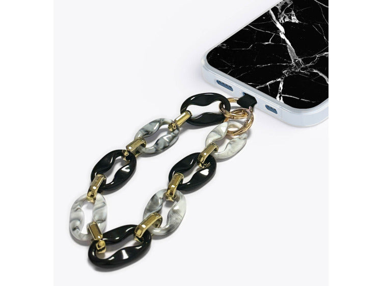 La chaîne courte Marble séduit par son contraste sophistiqué de maillons noirs et blancs, évoquant les veinures du marbre. Agrémentée de détails dorés, elle confère une allure luxueuse et minimaliste à votre téléphone. Cet accessoire est parfait pour un look épuré et chic.