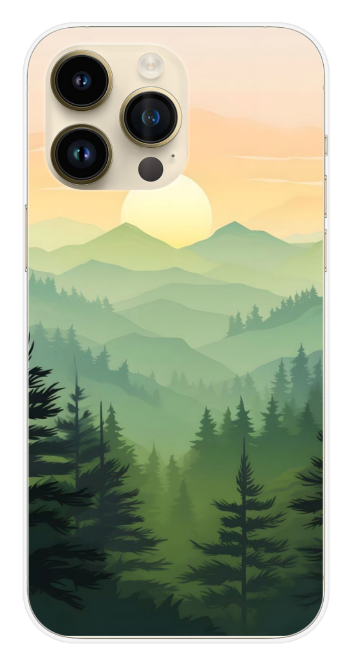 Coque Design "Dawn's Radiance" – Forêt de Pins & Montagnes au Lever du Soleil